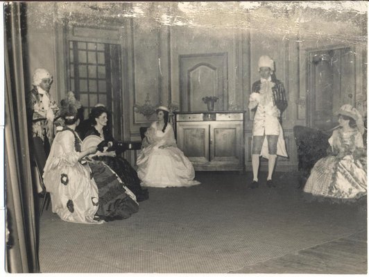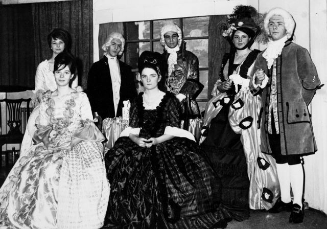 by Richard Brinsley Sheridan With elaborate costumes made in the needlework department under the direction of Mrs Bosworth. Richard Brinsley Sheridan’s ‘The School for Scandal’ was presented on the evenings of 26th to 30th March 1963. A cast of 23 took to the stage of the school hall, playing to packed houses on the last two nights. The play was produced by English teacher, Mr. H. Smith. Then with, but not in, the costumes the cast accompanied by the French exchange pupils, travelled by train to Roanne. The venue originally arranged, the 'Salle Jotilon', was quickly dismissed as too small and generally unsuitable. So the play was moved to the 'Théatre Municipal de Roanne' where the professional technicians were brought in to arrange suitable scenery and lighting. The plot was explained by Mr. Goodburn, in French, to the audience before the curtain rose on 6th April. |