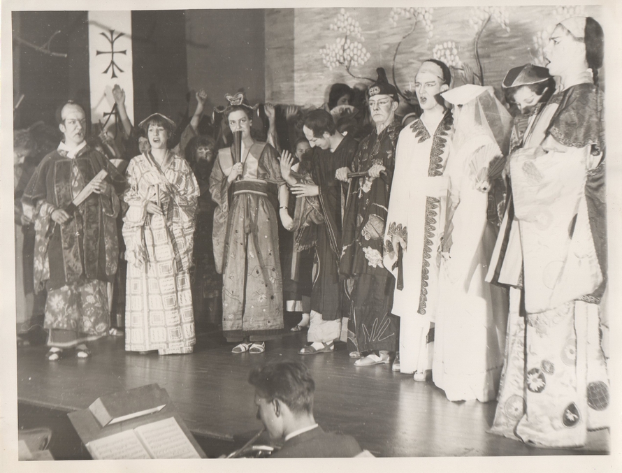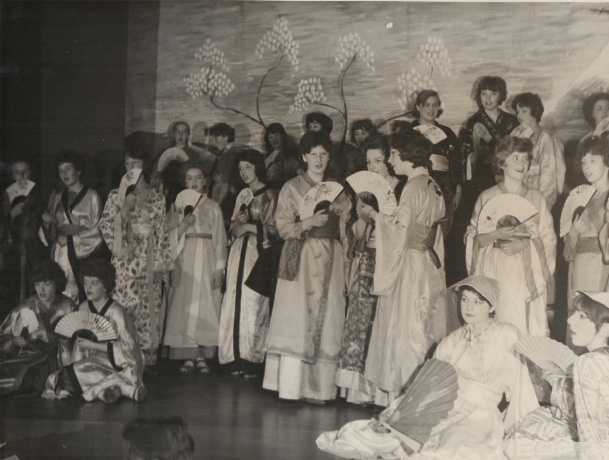 by W.S. Gilbert & Arthur Sullivan Just three months later the Manor Park's first Gilbert and Sullivan operetta, 'The Mikado' was performed over three evenings 10th - 12th July 1963. With a cast of 80 plus an orchestra, it was a rather bigger production than 'A School for Scandal' and included P.E. teacher Mr. Clowes in the title role. It was met with great acclaim in the local press: "Full marks go to the production and direction of this show", "A highly successful and entertaining production". It had been a busy two or three terms for the needlework, woodwork and art departments producing the costumes and scenery for the two productions! |
