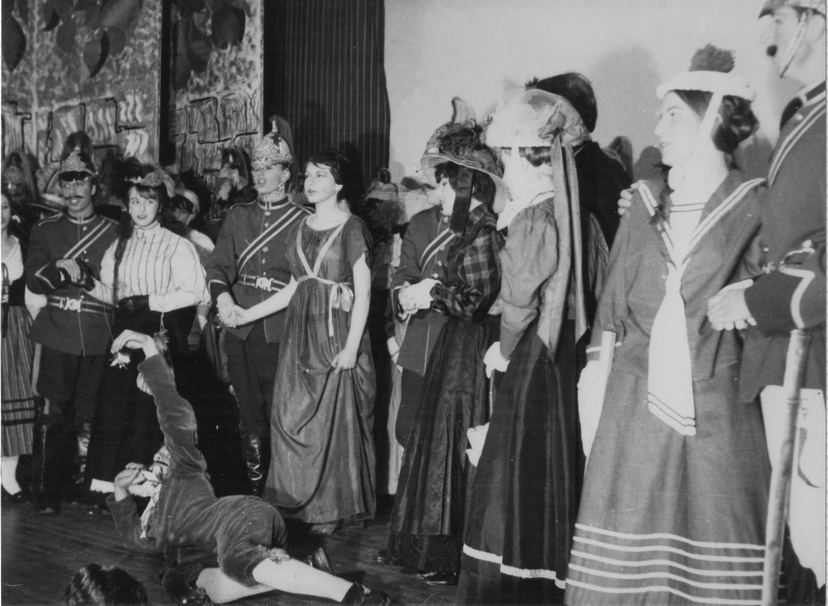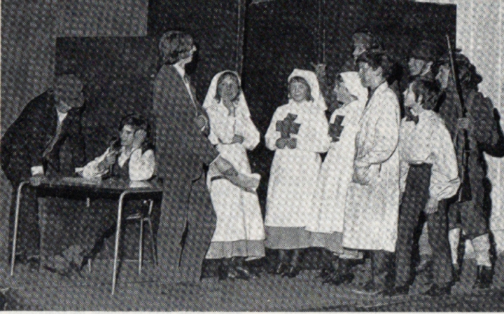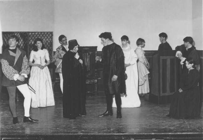 Thornton Wilder 16th-18th March 1961 Performed by a cast of 29, almost entirely from the lower 6th, the play was not liked by the "critic" from the 'Nuneaton Tribune', "the play as written by Wilder is dull ….. roused .. to become at best, half-awake. This must be taken by Mrs Rochford [producer] and her cast as a compliment." ! Thanks to Elvie Palmer (as was) this photograph has recently been added to the archive. |