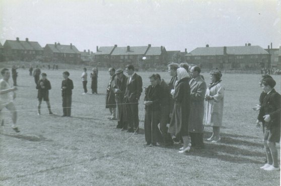 school field (late 1950s) Among the staff are Mr Walker (in the cap) and Mr Bacon and Mrs Bosworth on the right.