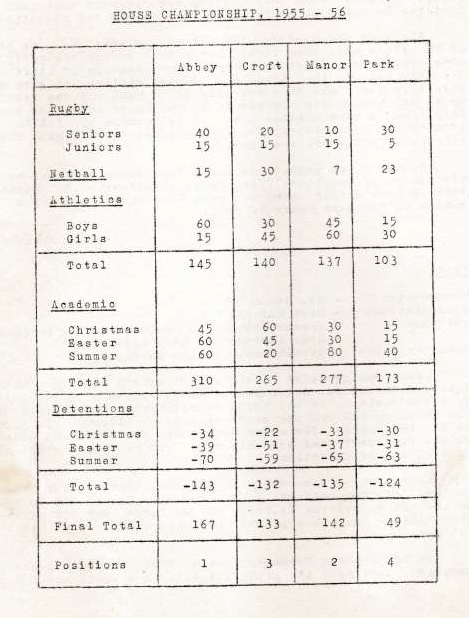 The Wheel No.1, No.6 & No.7 Thanks to old scholars John Bell, Frank Parker and Joyce Wardle we are slowly closing the gap in our collection of each edition of 'The Wheel'. The school magazine has proved to be the most valuable resource in recording the history of the school. I'm sure that Mr Mason et al would be very impressed by the first hand accounts of the contributors, especially when viewed from 50 to 70 years after they were written. From No.7 we can update 'A Short History', appendix 1 to show that it was the first edition to be produced 'in house' by the commerce department in quarto format, rather than the last of the professionally printed editions. And details in appendix 2 updated to show that Abbey won the Rugby and the House Championship, while Croft won the netball in 1955-56. Further scrutiny of the table shows that, unusually, Park came top (or bottom depending on how you look at it) of 'Detentions'. |