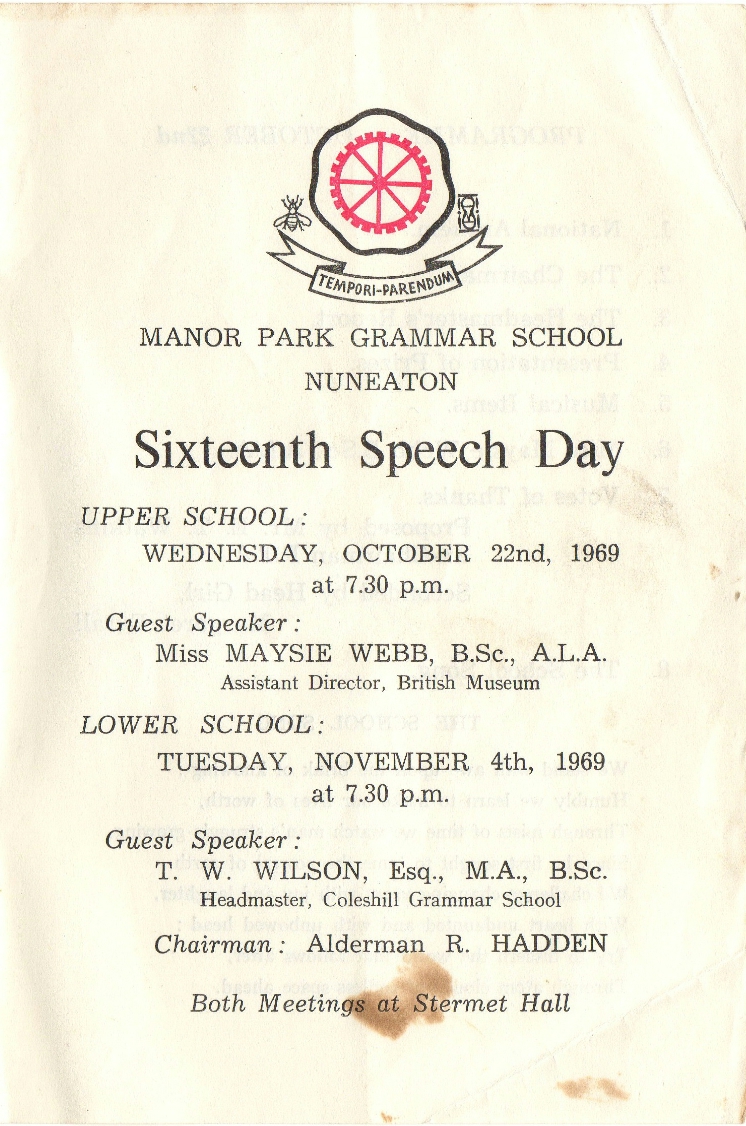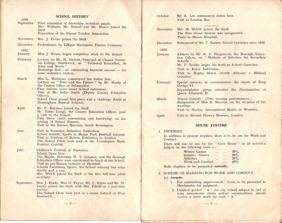 held almost nothing. This situation has been very much corrected thanks to generous donations and loans by several old scholars. All of these have been scanned to form a digital archive and the donated original documents, including an almost complete set of school magazines, have been passed onto the County Record Office. The digital archive is available to see at Nuneaton Library, the Chilvers Coton Heritage Centre and at Warwick. But we are always open to receive additional items, stories, photographs etc. either donations or loans. Your chance to be recorded for posterity! In particular we would like to see:- Form photographs that were taken during the school year 1956/7. It seems that every form was photographed plus the staff and the choir. We appear to be missing forms 3D, 4M and the lower sixth form. 'The Wheel', early editions, numbers 2,4 and 5 published between 1952 and 1956.