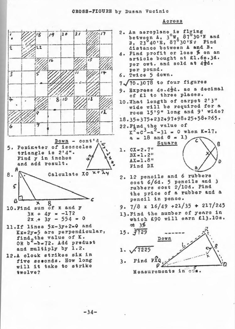 Thanks to John Smith who has donated, along with other items, a copy of the programme for the sixteenth speech day, 1969, filling a gap in the archive. Right, the recently rediscovered page 34 from 'The Wheel', number XII. Dusan Vucinic was infamous for his 'Cross-Figures' that regularly appeared in the school magazine around this time. There may be typing errors, etc that make this not the easiest quiz to complete, but anyone who learnt under Mr. Bacon, Mr. Mills, Mr. Sidall or Mrs Humphies et al should have little trouble! |