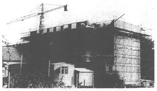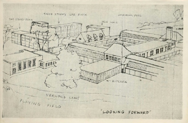 A sketch of the planned extensions to Manor Park, published in 'the Wheel' No. 17, Summer 1963, shortly before work on "phase 1", the "Three Storey Lab. Block" began. The "New Hall" would not be built until 1974, after the school had become comprehensive. The kitchen, allowing school dinners to be cooked on site, would never be built. Those of us who were at Manor Park in the sixties saw the area to the right of the main drive become a building site, which grew into the science block. With three floors consisting of six science laboratories as well as classrooms and a common room for sixth formers, it was by far, the largest extension to the school. Both the physics and general science laboratories, that had been temporarily housed in workshops either side of the metalwork rooms, moved into the new building. Biology and Chemistry moved from laboratories on the north side of the quadrangles allowing more space for the library and the staff room. Mr Dunkerley's woodwork room could now move from the 1928 "craft room" (room 9) to occupy one of the vacated workshops, while the other became the art room. Music moved from room 8 to the much more spacious room 9.